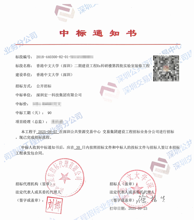 深圳宏一科技集团凭借卓越的技术实力和良好的行业口碑,在激烈竞争中脱颖而出,成功中标香港中文大学(深圳)二期建设工程Rx科研楼第四批实验室装修工程。这一重要中标体现了教育界对宏一科技专业技术与服务品质的充分肯定。