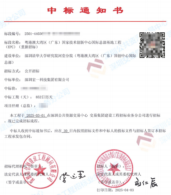 2025年3月1日,深圳宏一科技集团凭借行业领先的“设计-施工-运维”全链条硬实力,成功中标粤港澳大湾区广东国家技术创新中心国际总部基地工程EPC总承包 项目